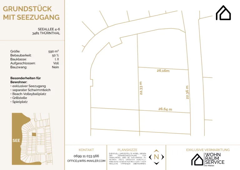 Träumen Sie von einem Zuhause, das Naturverbundenheit mit modernem Komfort vereint? Dieses 590m² große Baugrundstück im malerischen Felser Seepark in Thürnthal, einem Ortsteil der Gemeinde Fels am Wagram, erfüllt all Ihre Wünsche. Eingebettet in die idyllische Landschaft der Wagramer Weinregion und ausgestattet mit exklusiven Annehmlichkeiten, bietet dieses Grundstück eine einmalige Gelegenheit, Ihre Wohnträume zu verwirklichen.